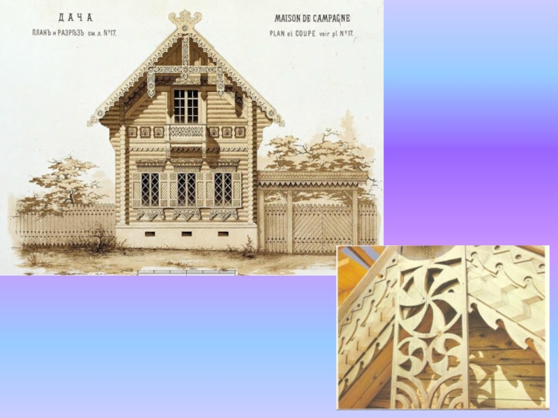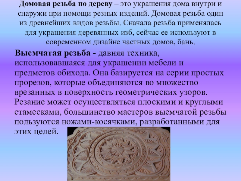 помощи резных изделий. Домовая резьба один из древнейших видов резьбы. Сначала резьба применялась для украшения деревянных изб, сейчас ее используют в современном дизайне частных домов, бань.