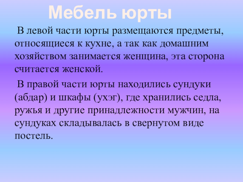 Слайд 30В левой части юрты размещаются предметы, относящиеся к кухне, а так