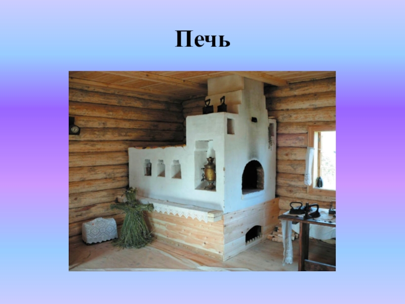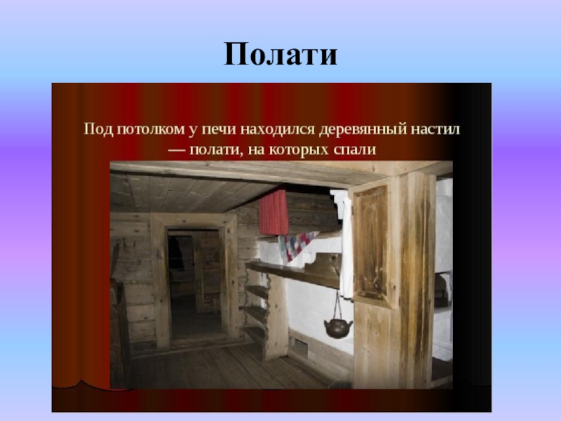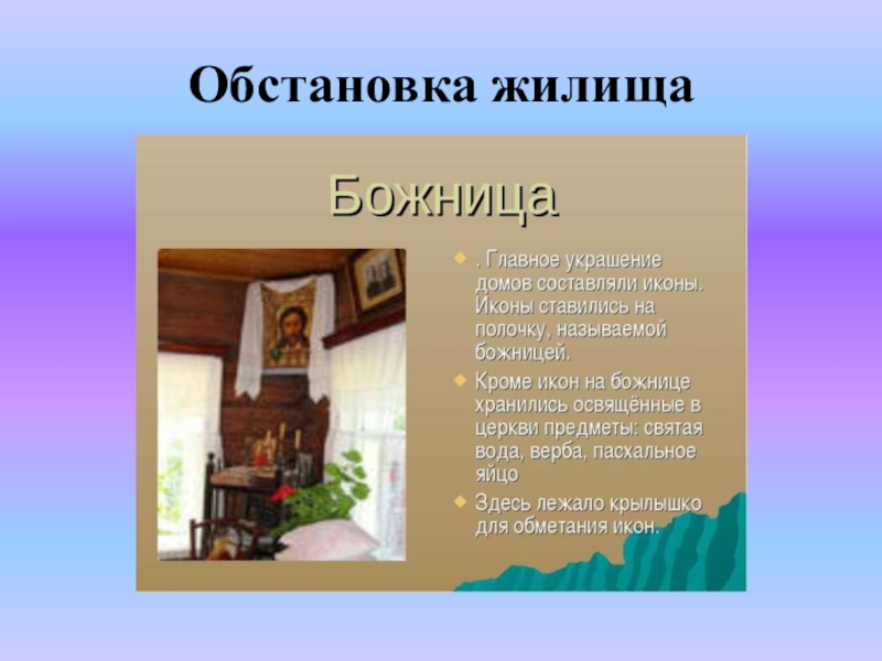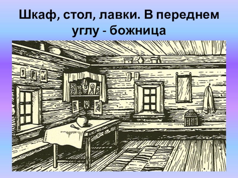 Слайд 85Шкаф, стол, лавки. В переднем углу - божница