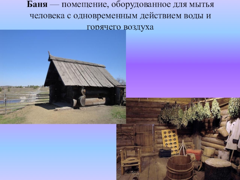 Слайд 45Ба́ня — помещение, оборудованное для мытья человека с одновременным действием воды и