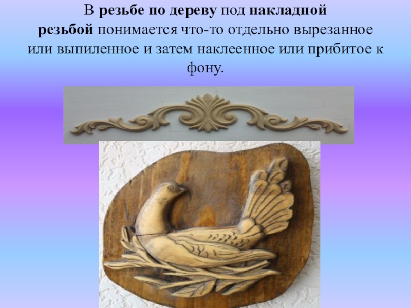 Слайд 54В резьбе по дереву под накладной резьбой понимается что-то отдельно вырезанное или выпиленное и затем