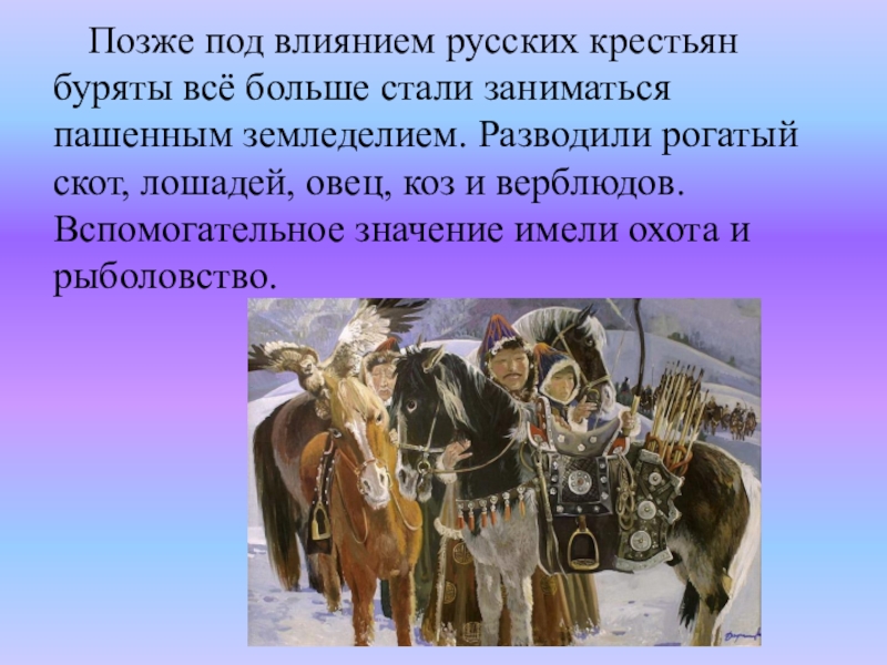 Слайд 21Позже под влиянием русских крестьян буряты всё больше стали заниматься пашенным