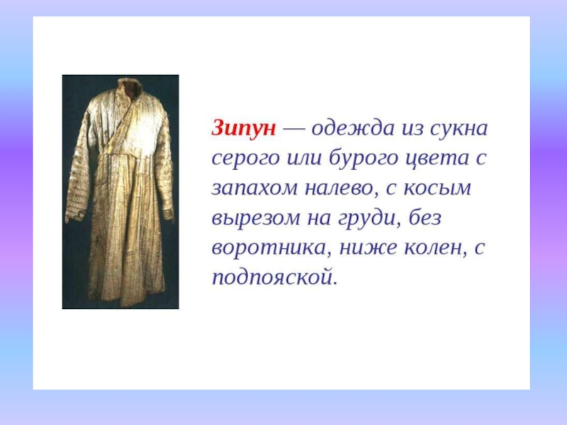 Зипун верхняя одежда у крестьян. Представляет собой кафтан без воротника, изготовленный