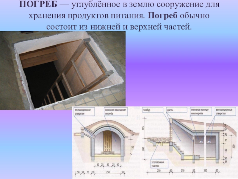 Слайд 44ПОГРЕБ — углублённое в землю сооружение для хранения продуктов питания. Погреб обычно состоит из