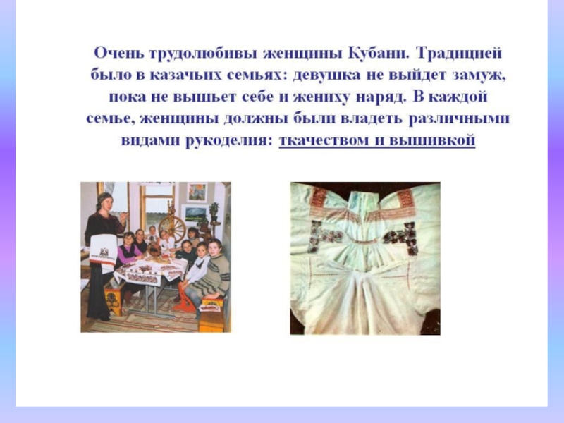 вышивка, выделка кожи и меха, овчины и ручное ткачество.
