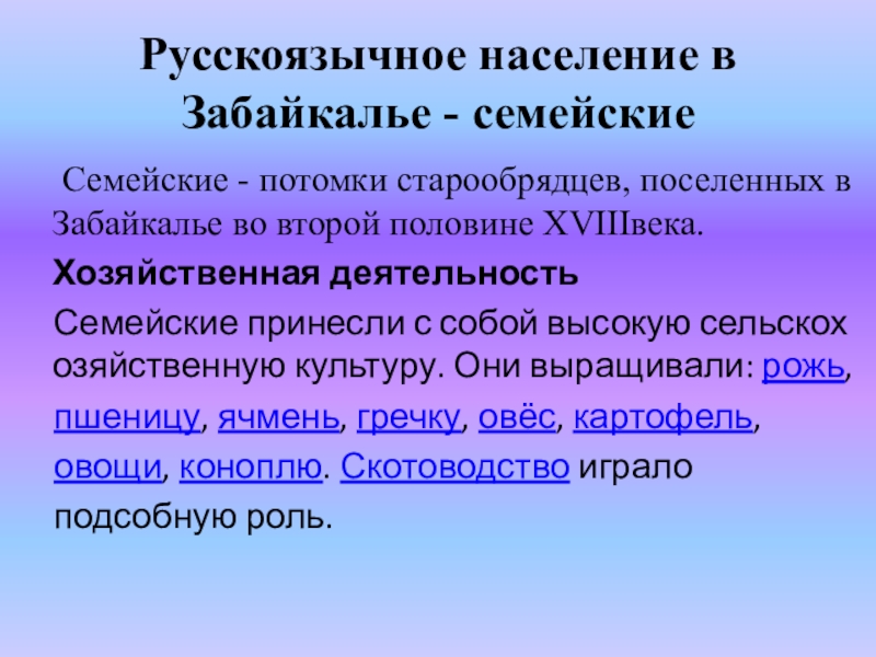 Семейские принесли с собой высокую сельскохозяйственную культуру. Они выращивали: рожь,