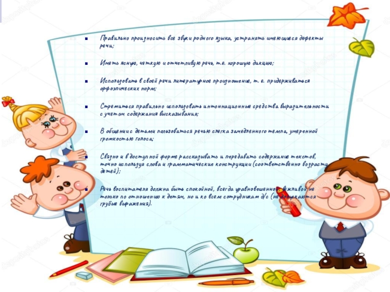 Речь воспитателя должна быть спокойной, всегда уравновешенной, вежливой не только по отношению к детям, но и ко всем сотрудникам д/с (не допускаются грубые выражения).