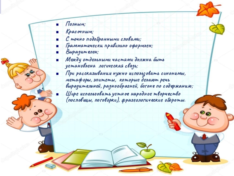 При рассказывании нужно использовать синонимы, метафоры, эпитеты, которые делают речь выразительней, разнообразней, богаче по содержанию;