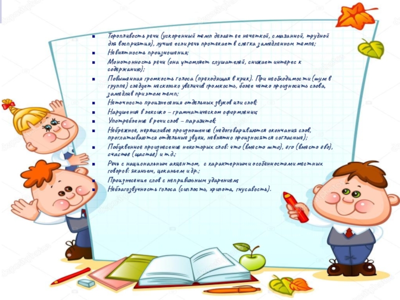 Монотонность речи (она утомляет слушателей, снижает интерес к содержанию);