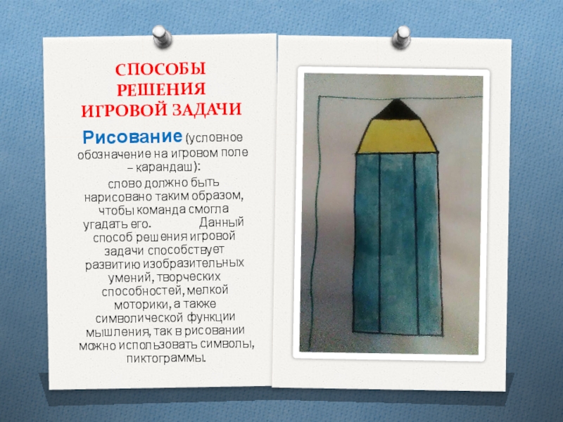 должно быть нарисовано таким образом, чтобы команда смогла угадать его. Данный способ решения игровой задачи способствует развитию изобразительных умений, творческих способностей, мелкой моторики, а также символической функции мышления, так в рисовании можно использовать символы, пиктограммы.