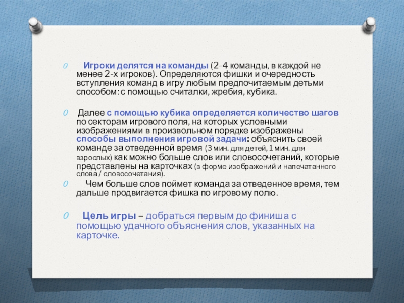 Цель игры – добраться первым до финиша с помощью удачного объяснения слов, указанных на карточке.