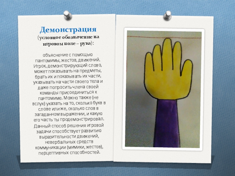 Слайд 8Демонстрация (условное обозначение на игровом поле – рука):