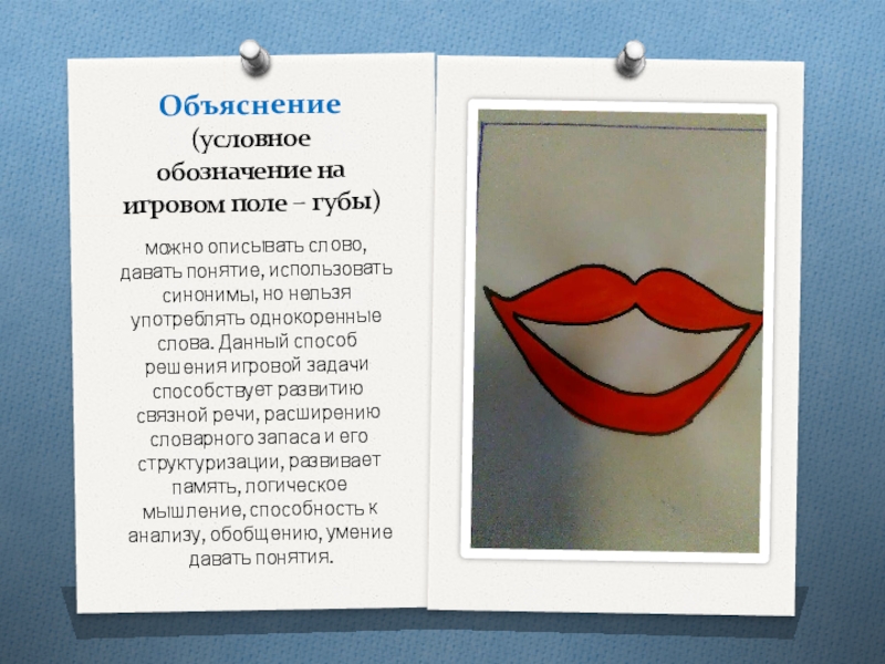 Слайд 7Объяснение (условное обозначение на игровом поле – губы)