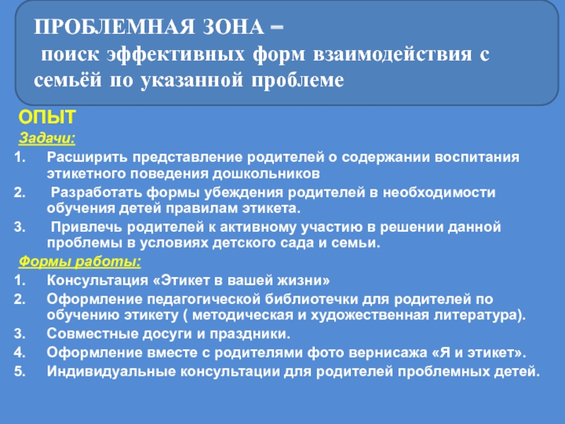 Разработать формы убеждения родителей в необходимости обучения детей правилам этикета.