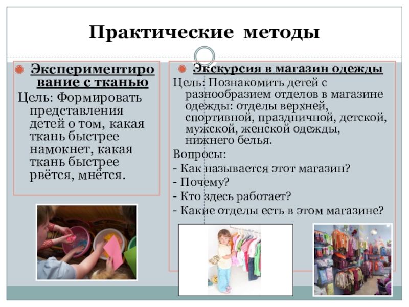 Цель: Познакомить детей с разнообразием отделов в магазине одежды: отделы верхней, спортивной, праздничной, детской, мужской, женской одежды, нижнего белья.