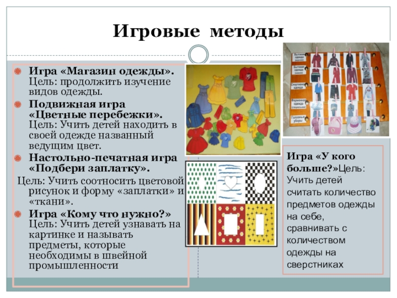 Игра «У кого больше?»Цель: Учить детей считать количество предметов одежды на себе, сравнивать с количеством одежды на сверстниках