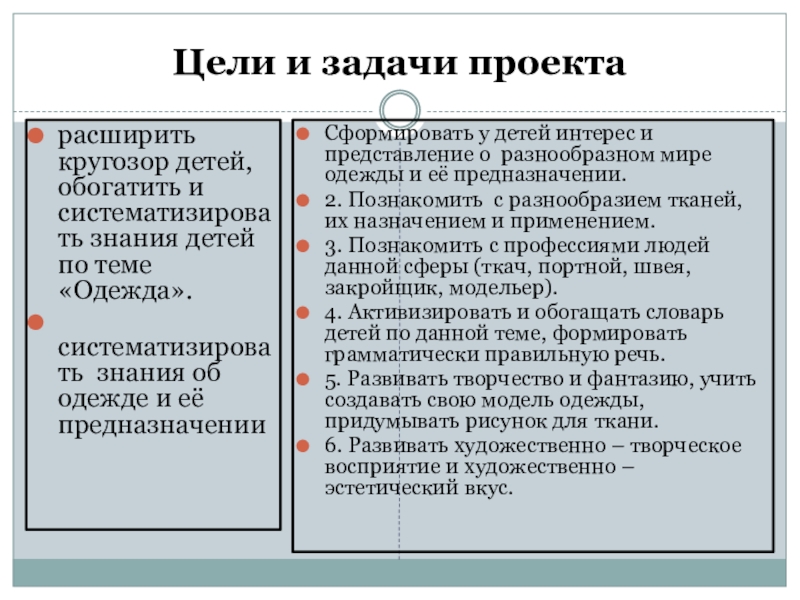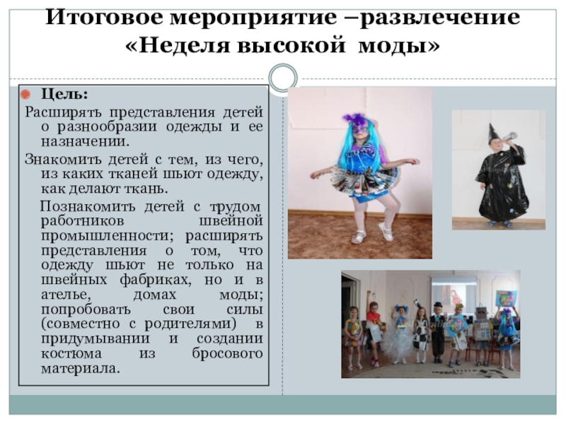 Сформировать у детей интерес и представление о разнообразном мире одежды и её предназначении.