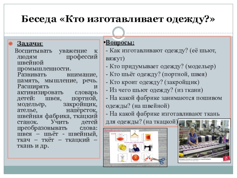 3. Познакомить с профессиями людей данной сферы (ткач, портной, швея, закройщик, модельер).