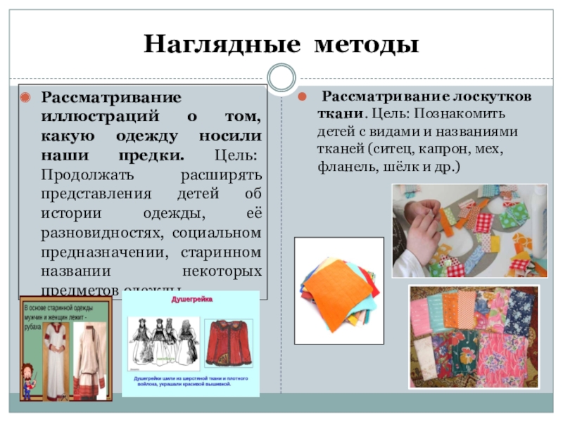 Рассматривание лоскутков ткани. Цель: Познакомить детей с видами и названиями тканей (ситец, капрон, мех, фланель, шёлк и др.)