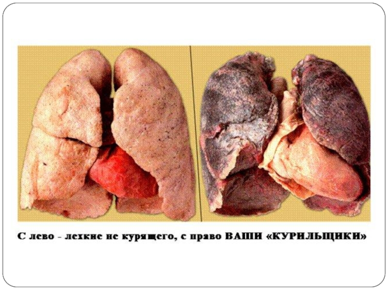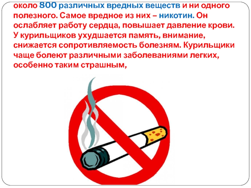 веществ и ни одного полезного. Самое вредное из них – никотин. Он ослабляет работу сердца, повышает давление крови. У курильщиков ухудшается память, внимание, снижается сопротивляемость болезням. Курильщики чаще болеют различными заболеваниями легких, особенно таким страшным,