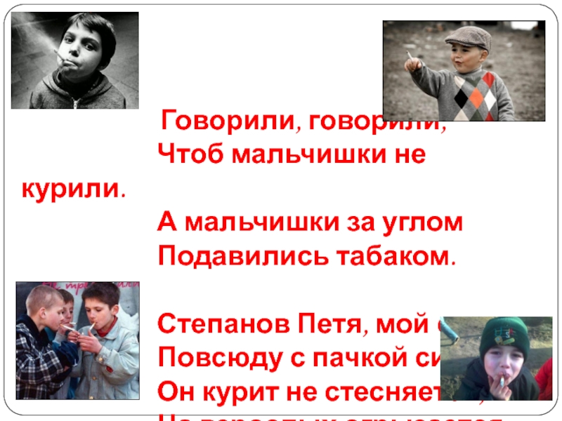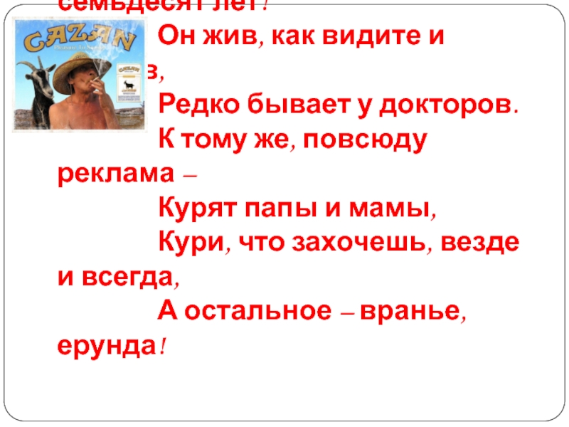 вам за беда?                 Курит давно мой дед,                А деду исполнилось семьдесят лет!                 Он жив, как видите и здоров,                 Редко бывает у докторов.                 К тому же, повсюду реклама –                 Курят папы и мамы,                 Кури, что захочешь, везде и всегда,                 А остальное – вранье, ерунда!