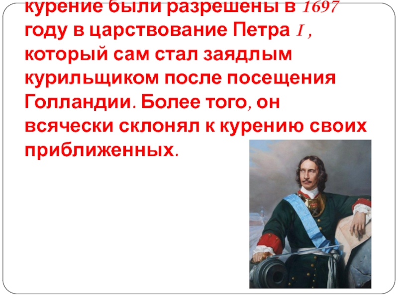 в царствование Петра I , который сам стал заядлым курильщиком после посещения Голландии. Более того, он всячески склонял к курению своих приближенных.
