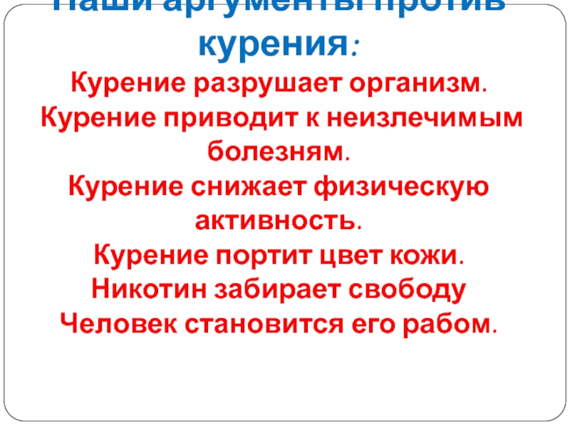 Наши аргументы против курения: Курение разрушает организм.  Курение приводит к неизлечимым болезням. Курение снижает физическую активность. Курение