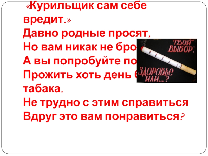 Давным-давно Минздрав твердит:  «Курильщик сам себе вредит.» Давно родные просят, Но вам никак не бросить, А