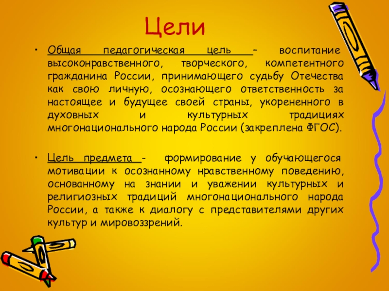 ЦелиОбщая педагогическая цель – воспитание высоконравственного, творческого, компетентного гражданина России, принимающего судьбу Отечества как свою личную, осознающего