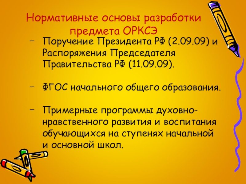Нормативные основы разработки предмета ОРКСЭПоручение Президента РФ (2.09.09) и Распоряжения Председателя Правительства РФ (11.09.09).ФГОС начального общего образования.Примерные