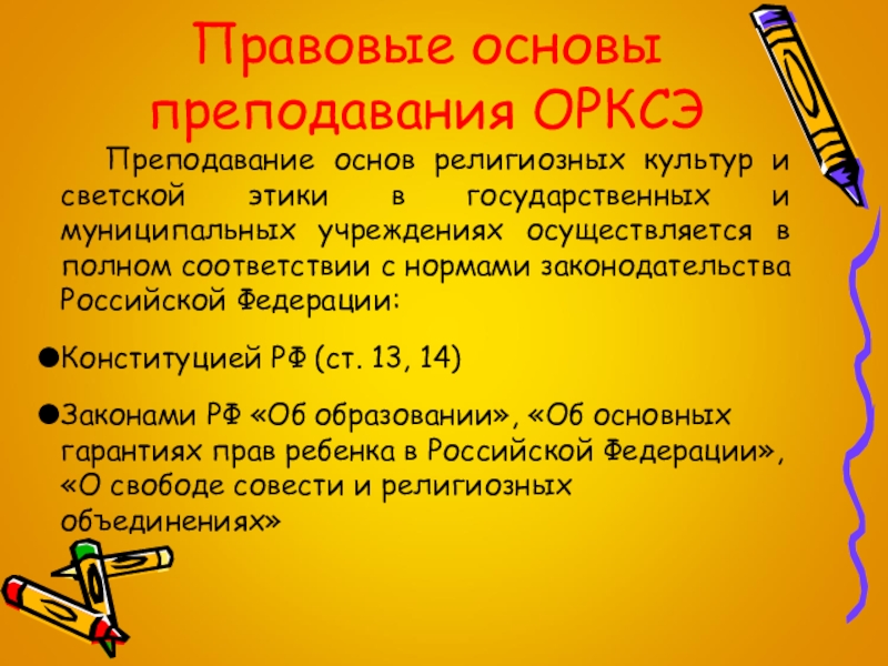 Правовые основы преподавания ОРКСЭ Преподавание основ религиозных культур и светской этики в государственных и муниципальных учреждениях осуществляется в полном соответствии с нормами законодательства Российской Федерации:Конституцией РФ (ст. 13, 14)Законами РФ «Об образовании», «Об основных гарантиях прав ребенка