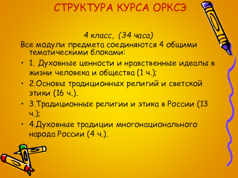 СТРУКТУРА КУРСА ОРКСЭ 4 класс, (34 часа)Все модули предмета соединяются 4 общими тематическими блоками: 1. Духовные ценности