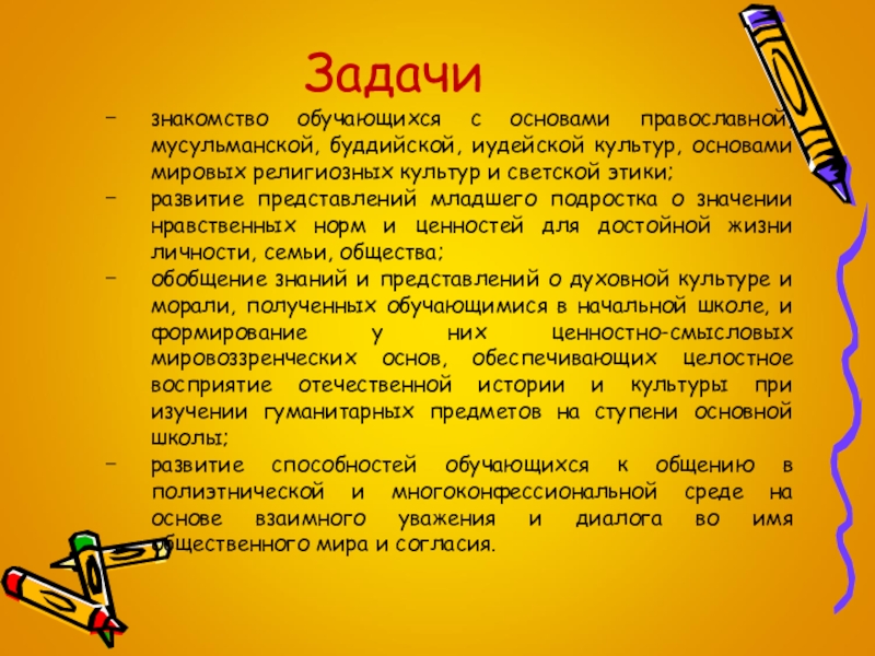 Задачизнакомство обучающихся с основами православной, мусульманской, буддийской, иудейской культур, основами мировых религиозных культур и светской этики; развитие