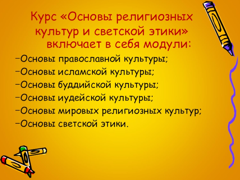 Курс «Основы религиозных культур и светской этики»включает в себя модули: Основы православной культуры;Основы исламской культуры;Основы буддийской культуры;Основы