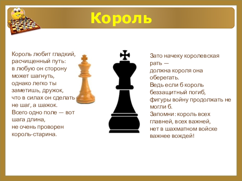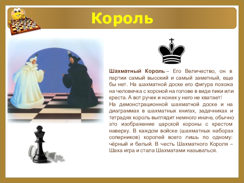 Шахматный Король – Его Величество, он в партии самый высокий и самый