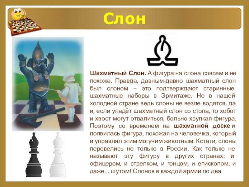 шахматный слон был слоном – это подтверждают старинные шахматные наборы в Эрмитаже. Но в нашей холодной стране ведь слоны не везде водятся, да и, если упадёт шахматный слон со стола, то хобот и хвост могут отвалиться, больно хрупкая фигура. Поэтому со временем на шахматной доске и появилась фигура, похожая на человечка, который и управлял этим могучим животным. Кстати, слоны перевелись не только в России. Как только не называют эту фигуру в других странах: и офицером, и стрелком, и гонцом, и епископом, и даже... шутом! Слонов в каждой армии по два.