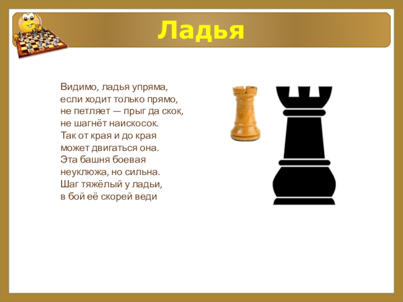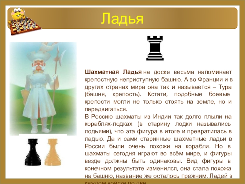 В Россию шахматы из Индии так долго плыли на кораблях-лодках (в старину лодки назывались лодьями), что эта фигура в итоге и превратилась в ладью. Да и сами старинные шахматные ладьи в России были очень похожи на корабли. Но в шахматы сегодня играют во всём мире, и фигуры везде должны быть одинаковы. Вид фигуры в конечном результате изменился, она стала похожа на башню, название же осталось прежним. Ладей в каждом войске по две.