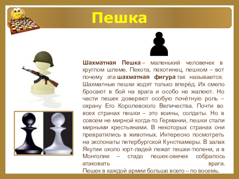 вот почему эта шахматная фигура так называется. Шахматные пешки ходят только вперёд. Их смело бросают в бой на врага и особо не жалеют. Но части пешек доверяют особую почётную роль – охрану Его Королевского Величества. Почти во всех странах пешки – это воины, солдаты. Но в совсем не мирной когда-то Германии, пешки стали мирными крестьянами. В некоторых странах они превратились в животных. Интересно посмотреть на экспонаты петербургской Кунсткамеры. В залах Якутии около юрт-ладей лежат пешки-тюлени, а в Монголии – стадо пешек-овечек собралось атаковать врага.