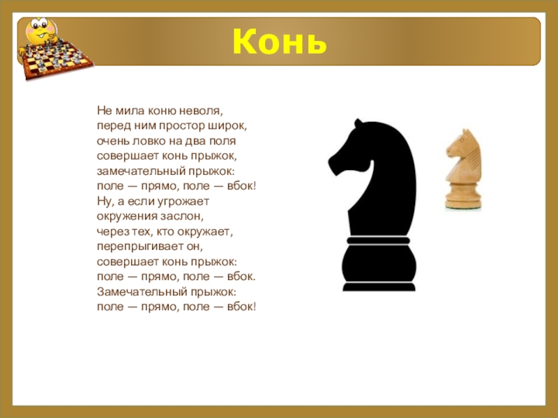 Прежде всего, гордый конь решил скинуть с себя своего седока – решил, что сам прекрасно справится. Да ещё за долгое время конь потерял длинные ноги и хвост. Осталась лишь лошадиная голова. Но очень лихая – прыгает! В славянских странах за свои прыжки его прозвали прыгуном и скакуном. Шахматных коней у противников по два.