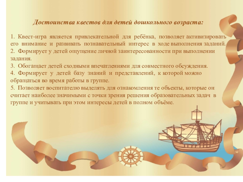 Слайд 12Достоинства квестов для детей дошкольного возраста: