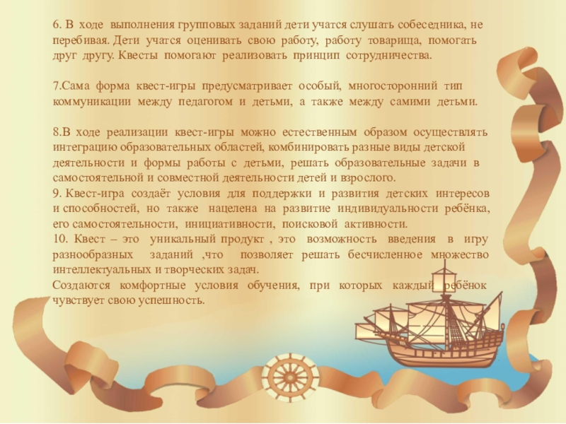7.Сама форма квест-игры предусматривает особый, многосторонний тип коммуникации между педагогом и детьми, а также между самими детьми.