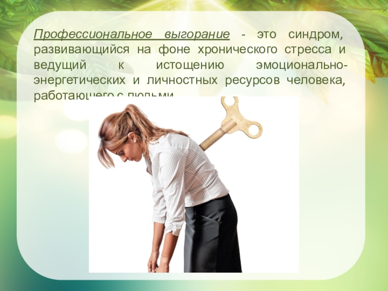 Слайд 4Профессиональное выгорание - это синдром, развивающийся на фоне хронического стресса и