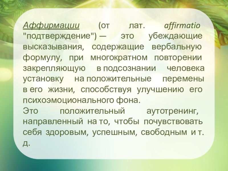 Слайд 7Аффирмации (от лат. affirmatio "подтверждение") — это убеждающие высказывания, содержащие вербальную формулу,