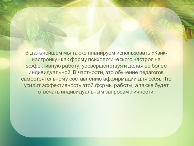 Слайд 12В дальнейшем мы также планируем использовать «Квик-настройку» как форму психологического настроя