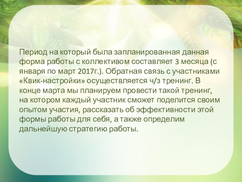 3 месяца (с января по март 2017г.). Обратная связь с участниками «Квик-настройки» осуществляется ч/з тренинг. В конце марта мы планируем провести такой тренинг, на котором каждый участник сможет поделится своим опытом участия, рассказать об эффективности этой формы работы для себя, а также определим дальнейшую стратегию работы.