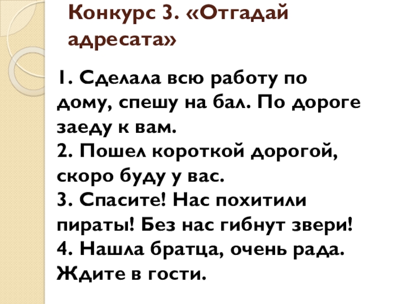 Конкурс 3. «Отгадай адресата» 1. Сделала всю работу по дому, спешу на бал. По дороге заеду к