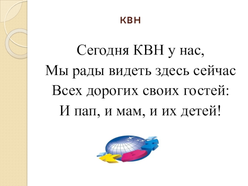 квнСегодня КВН у нас,Мы рады видеть здесь сейчасВсех дорогих своих гостей:И пап, и мам, и их детей!