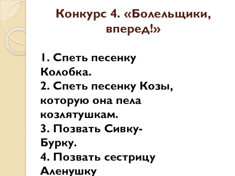 Конкурс 4. «Болельщики, вперед!» 1. Спеть песенку Колобка.2. Спеть песенку Козы, которую она пела козлятушкам.3. Позвать Сивку-Бурку.4.