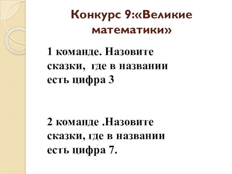 Конкурс 9:«Великие математики» 1 команде. Назовите сказки, где в названии есть цифра 3 2 команде .Назовите сказки,