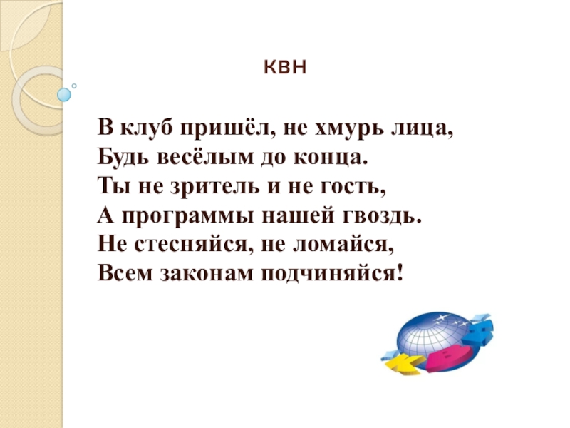 квнВ клуб пришёл, не хмурь лица,Будь весёлым до конца.Ты не зритель и не гость,А программы нашей гвоздь.Не
